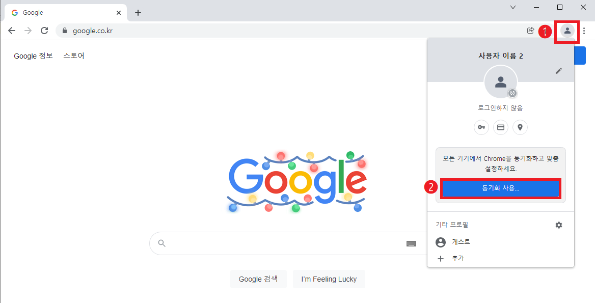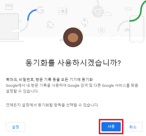 크롬을 실행한 뒤 화면 오른쪽 상단에서 [Google 계정] 버튼 클릭 후 [동기화 사용] 버튼을 차례로 클릭합니다.