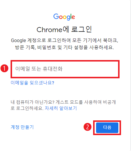 02 크롬에 로그인하기 위해 계정을 등록할 때 설정한 사용자의 이메일 또는 휴대전화 번호를 입력하고 [다음] 버튼을 클릭합니다.