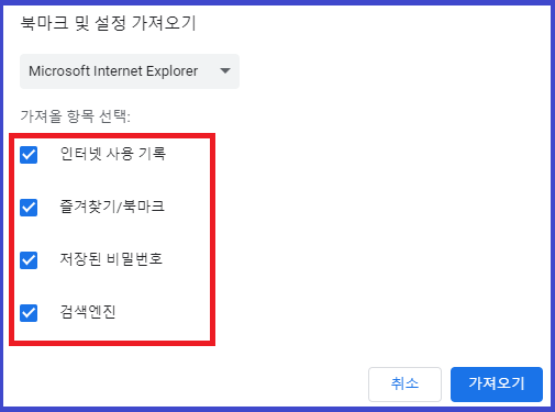 이전에 사용하던 브라우저를 선택하면 가져올 수 있는 항목이 나타납니다. 인터넷 사용 기록, 즐겨찾기/북마크, 저장된 비밀번호, 검색엔진 중 필요한 항목만 선택하면 됩니다. 일일이 옮길 필요가 없습니다.